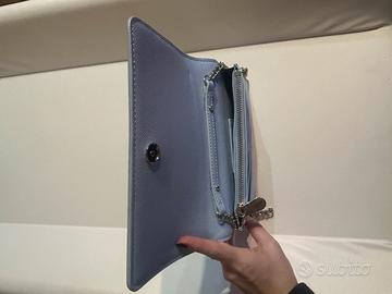 Elegante pochette Tommy Hilfiger in pelle saffiano color azzurro chiaro con tracolla a catena argentata.