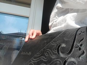 fatta di pelle, 3 scomparti a fisarmonica che si chiudono con clips ben funzionanti, taschino interno con cerniera. manico con logo valentino, modulabile per presenza di forellini che si può mettere semplicemente attaccandolo alle due clip sotto il primo scomparto della borsa, di pelle nera e all'interno di stoffa. va bene per ogni occasione. in regalo un piccolo accessorio moda che scoprirete voi....! scrivete solo a me o a subito, non fate di testa vostra. Vivivividolcegatta85. ultimo prezzo. Per favore NO corrieri UPS