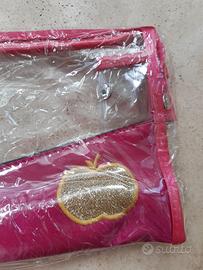 Pochette trasparente in PVC con dettagli in tessuto raso color fucsia, decorata con una mela glitterata dorata. Nuova, mai utilizzata, ancora con cartellino e bustina protettiva in plastica. La chiusura a zip è arricchita da un charm a forma di diamante, come visibile in foto. Dimensioni: circa 23 x 24 cm. Perfetta per il make up o per le creme solari.