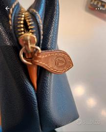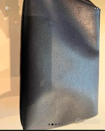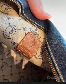 Pochette Trussardi in pelle martellata con inserti in cuoio. Colore blu scuro con dettagli marroni Chiusura a zip superiore dorata