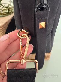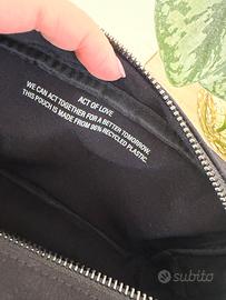 Trousse de toilette in cotone nero, reworked in una bellissima camera bag con manico regolabile per portarla comodamente a spalla o tracolla. Nuova mai indossata, ancora con involucro originale. Dimensioni L.22 H.15 P.6