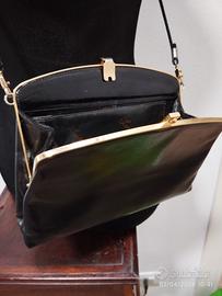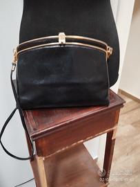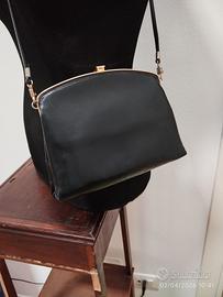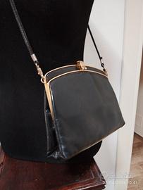 deliziosa pochette vintage in pelle blu scura, tracolla staccabile in pelle, chiusura a clip e inserti in metallo dorato (15x23 cm)