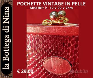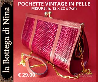 Splendida pochette/clutch bag vintage in pelle con texture effetto serpente, color rosso bordeaux. Misure: 22 x 12 x 7 cm. Pezzo elegante e ricercato, perfetto per serate ed eventi speciali. Caratteristiche: Materiale: pelle con stampa rettile (effetto pitone/serpente) Colore: rosso bordeaux brillante Chiusura: fermaglio a pressione doppio in metallo dorato (stile "kiss lock") Tracolla: catena in metallo dorato + cinturino in pelle, removibile Usabile come clutch o mini bag a spalla Interno in pelle liscia rosa/salmone Medaglione/logo sul fronte Condizioni: vintage, ottimo stato