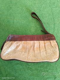 pochette vintage Just Cavalli in tela beige con logo e dettagli in pelle marrone. ha qualche piccolo segno d'uso dato dal tempo. misure 12x25
