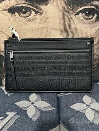 Stupenda pochette clutch Zadig & Voltaire in eco nera con scritte a rilievo. Misure 30x18 cm. In omaggio charms Zadig angioletto bianco.