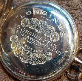 Poket longines 6 grand prix paris argento e incappucciato oro , produzione circa 1908 , vetro minerale cuervo sobrinos , quadrante e lancette originale in porcellana diametro cassa 40 mm , spettacolare tutto originale revisionato e perfettamente funzionante da collezione per appassionati del genere no perditempo