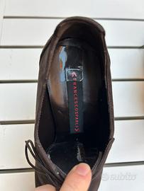 Polacchine con lacci, tacco largo alto 10 cm con plateau interno, scamosciate color testa di moro, taglia 39, tutta vera pelle e cuoio. In ottime condizioni perché usate poche volte.