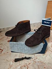 Desert boot in pelle scamosciata, un modello iconico dell'azienda italiana Frau. Tomaia in morbida pelle scamosciata. Fodera in pelle.