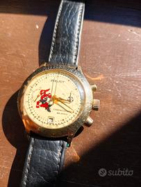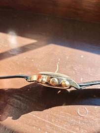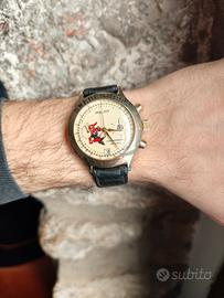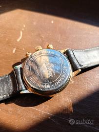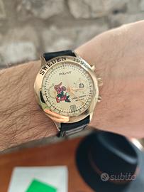 Bellissimo crono vintage degli anni ’90 in un'edizione speciale dedicata ai campionati europei di calcio Svezia 92. L’orologio si trova in condizioni esemplari per la sua età, ha un movimento meccanico a carica manuale cronografico 23 rubini cal. 3133. Funzionamento perfetto, il cronografo parte e azzera regolarmente, la data a ore 6 scatta regolarmente alla mezzanotte, la marcia è precisa e regolare. L’orologio mantiene bene il tempo, risultando perfettamente utilizzabile. La cassa ha un diametro di 38mm, è placcata in oro e si presenta in ottime condizioni estetiche, fondello in acciaio. Il quadrante dorato con dettagli neri, indici dorati, mascotte degli europei svedesi e pallone sul piccolo quadrante cronografico dei minuti offre un’estetica molto particolare: sportiva, inedita e ben bilanciata. La scala tachimetrica interna e i dettagli dorati aggiungono carattere e profondità, rendendo il design particolarmente interessante. Un cronografo Poljot in una versione introvabile, dal grande fascino vintage, robusto e funzionale, ideale per chi cerca un orologio meccanico con complicazioni a un prezzo interessante e con forte personalità. L'orologio proviene dalla mia collezione privata, le foto formano parte integrante della descrizione e sono reali dell'oggetto in vendita, pertanto la vendita si configura nella formula visto e piaciuto (AS IS). Preferito il ritiro a mano in Umbria, Lazio e Campania, posso comunque spedire.