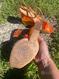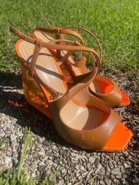 Bellissimi sandali da donna, col tacco particolare a zeppa arancione trasparente, tacco 11,5 cm, sandalo elegante classico in pelle marrone chiaro, intreccio davanti con chiusura laterale con la fibbia.