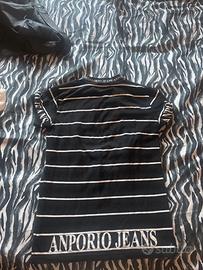 Maglietta polo anporio jeans mai indossata, colore blu scuro con righe orizzontali bianche. Taglia M