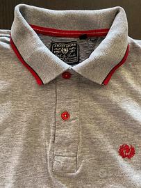 Polo in jersey cotone viscosa grigio mélange Ascot Sport, taglia L. Profili maniche e collo rosso + blu, bottoni rossi, sottocollo a righe bianche e blu. Logo ricamato rosso; etichetta a bandiera fianco sinistro; spacchetti laterali. Composizione 90% Cotone 10%Viscosa.