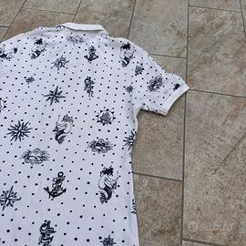 Polo bianca con dettagli di stampa nautica in nero. La maglia presenta un colletto classico e bottoni sul davanti.