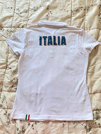 -realizzata in morbido e fresco cotone. Il capo, con colletto classico impreziosito dal piping tricolore, riprende le personalizzazioni delle altre proposte della collezione, come la stampa sulla schiena "ITALIA" e i loghi istituzionali riportati sulla parte frontale.
