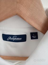 Maglietta polo bianca a maniche corte con colletto e abbottonatura, in poliestere. Taglia L. Nuovo senza cartellino.