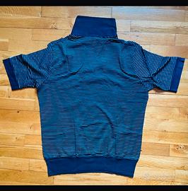 Polo donna, taglia M, mezza manica, buona vestibilità, colore blu a righe orizzontali bianche, 100% cotone