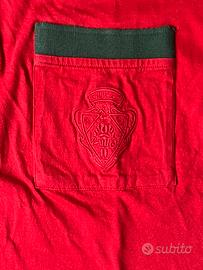 Colore rosso con dettagli verdi su colletto, maniche e taschino.