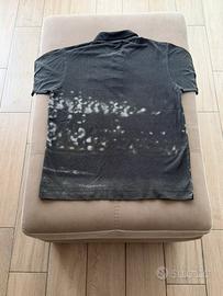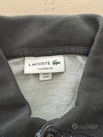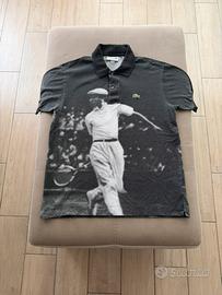 Splendida e rara polo Lacoste Originale in cotone piqué, color grigio/nero con un’originale stampa grafica "halftone" (a puntini) che raffigura il fondatore René Lacoste in azione sul campo da tennis. Un pezzo iconico che unisce lo stile sportivo classico a un tocco street/artistico.