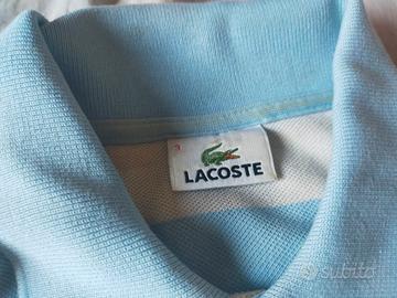 Polo marca Lacoste taglia 3 vestibilità regolare a righe celeste grigio bianco...sul colletto segni di usura dati dall'utilizzo. Sul fondo fatto lavoro di sartoria per accorciare la lunghezza.