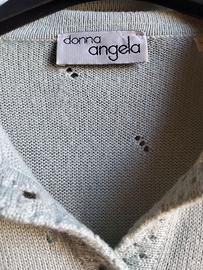 maglia a maniche lunghe con colletto a polo presenta un caratteristico motivo traforato e dettagli eleganti come i bottoni e il profilo del taschino decorati con perle. Marchio Donna Angela, maglieria classica e vintage. Chiusura a tre bottoni con perle, taschino frontale profilato. Occasione: Casual sofisticato o abbigliamento da giorno classico.