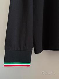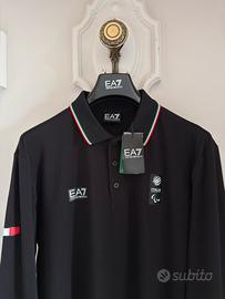 Polo da uomo con maniche lunghe EA7. Divisa ufficiale dei Giochi Olimpici e Paralimpici invernali di Milano Cortina 2026. Colore nero. Logo istituzionale CIP sul petto a sinistra. Logo EA7 sul petto a destra. Dettaglio tricolore sui polsini e collo. Dettaglio tricolore stampato a contrasto sulla manica destra. Personalizzazione sulla schiena con maxi stampa “ITALIA”. Taglia L. Spalle - 47cm, da ascella ad ascella - 55cm, lunghezza - 69cm, lunghezza manica - 69cm. Nuovo con cartellino.