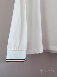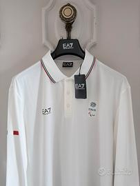 Polo da uomo con maniche lunghe EA7. Divisa ufficiale dei Giochi Olimpici e Paralimpici invernali di Milano Cortina 2026. Colore bianco. Logo istituzionale CIP sul petto a sinistra. Logo EA7 sul petto a destra. Dettaglio tricolore sui polsini e collo. Dettaglio tricolore stampato a contrasto sulla manica destra. Personalizzazione sulla schiena con maxi stampa “ITALIA”. Taglia L. Spalle - 47cm, da ascella ad ascella - 56cm, lunghezza - 69cm, lunghezza manica - 66cm. Mai indossata. Nuovo con cartellino.