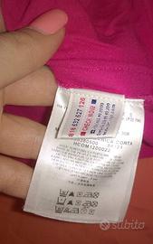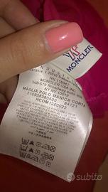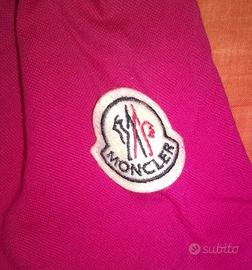 Polo Moncler donna taglia S, autentica, nuova mai stata indossata. Modello con scollatura, colore fucsia con dettagli bianchi e profili laterali . Capo originale! Prezzo listino 190 euro.