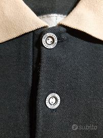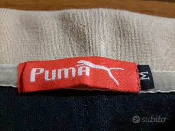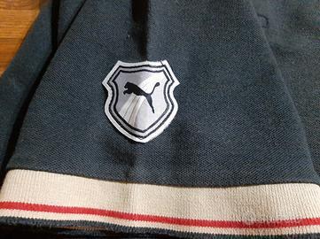 Polo Puma, linea Classic, taglia M. Colore blu scuro. Logo Puma ricamato color oro e patch a scudo sulla manica, con bandiera italiana ricamata sul retro. Colletto e bordi maniche rifiniti in beige/crema e rosso. Capo usato in ottime condizioni.