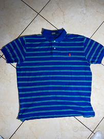 Classica polo Ralph Lauren in cotone, dal colore blu intenso con sottili righe verdi e l'inconfondibile logo rosso ricamato sul petto. Perfetta per un look casual ma curato, ideale sia per il tempo libero che per un outfit estivo elegante.