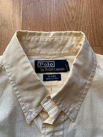 Camicia Polo Ralph Lauren da uomo a manica corta, in elegante tonalità giallo chiaro / crema. Realizzata in cotone leggero e traspirante, ideale per la stagione estiva. Il colletto button-down e il logo Polo ricamato sul petto mantengono lo stile classico e riconoscibile del brand. Perfetta per outfit casual, estivi o smart-casual, da indossare con jeans, chino o bermuda.