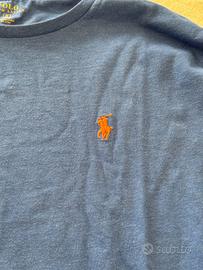 Maglia Polo Ralph Lauren originale, colore blu con logo ricamato arancione. Taglia S, vestibilità regolare. Condizioni buone, segni di normale utilizzo ma nessun difetto evidente. Capo versatile e facile da abbinare, perfetto per uso quotidiano.