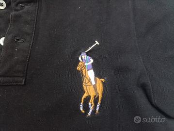 Maglia polo Ralph Lauren da uomo, colore nero con dettagli bianchi, gialli e viola.