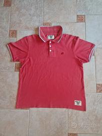 Polo originale Russell Athletic da uomo, colore rosso con dettagli bianchi su colletto e maniche. Chiusura a tre bottoni, logo "R" ricamato sul petto e patch cucita sul fondo.