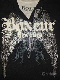 Maglia a forma di polo con colletto nera e bianca maniche corte, con disegno ali di angelo argentate sul davanti. Marca boxeur des rues taglia XL (veste attilata ma elasticizzata) 100% cotone
