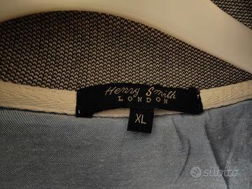 Polo da uomo Henry Smith London, taglia XL, in cotone, fantasia a righe blu su fondo bianco, colletto grigio mélange con chiusura a tre bottoni e logo ricamato sul petto.