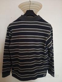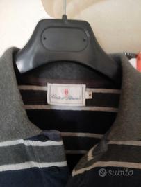 Polo a maniche lunghe a righe orizzontali del marchio italiano Conte of Florence. A strisce orizzontali blu navy, grigio e bianco opaco, taglia M. Colletto a polo in tinta unita colore grigio scuro con chiusura a tre bottoni. Sul lato sinistro del petto il logo "C" stilizzata. Tessuto in jersey di cotone. Usato in buone condizioni.