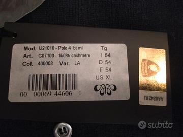 Vendo Polo uomo articolo di lusso tg 54 nera 100% cashmere marca Automobili Lamborghini distribuito da Falda Cashmere. Con logo ricamato davanti in basso a sinistra. Nuovissima con cartellino e confezione originale. Pagata 410€ vendo per acquisto taglia errata. (Misure da spalla a spalla 45 cm, lunghezza da collo al bordo inferiore 68 cm)