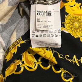 Colore nero con dettagli oro e stampa barocca iconica, tipica dello stile Versace.