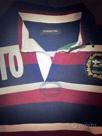 Vendo polo a maniche lunghe stile rugby, a righe orizzontali rosse, blu e bianche. Dettagli con numero "10" sul petto e patch ricamata "Bristol University". Chiusura con bottoni. Tessuto in cotone, comoda e resistente. In buone condizioni, indossata poche volte. Taglia M.