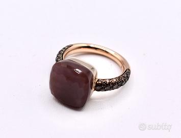 Anello Pomellato collezione Nudo Chocolate Maxi in oro rosa con lunetta in oro bianco, pietra di luna sfaccettata marrone scuro e diamanti marroni ct. 0,76.