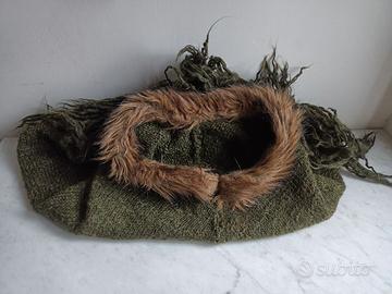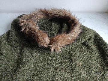 Poncho/mantella (Cod 140), lavorato a ferri, misto lana, con filato di spessore misto (varia dallo spessore al fino), leggermente pelosa, colore verde oliva. Le frange misurano cm 22. Tg M, misure: lunghezza fianchi senza frange 60, lunghezza centrale senza frange 73, circonferenza collo 74, circonferenza spalle 96.