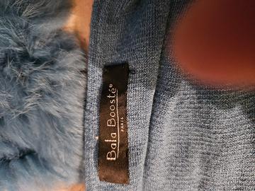 splendido poncho/mantella firmato Bala Boosté Paris, elegante e caldissimo. Il capo è realizzato con una base in maglia di lana e arricchito da soffici strisce di vera pelliccia di lapin (coniglio) lavorate a trama diagonale, che donano movimento e volume.