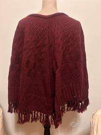 Poncho/mantella in maglia color bordeaux con frange decorative lungo l'orlo inferiore e laccetti
