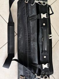 Porta abiti Alviero Martini in pelle nera con classico disegno del mondo in grigio chiaro.