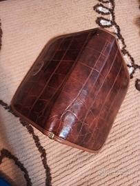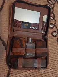 Borsello porta accessori da viaggio, in pelle. Contiene uno specchio, un mini calza scarpe, una spazzola, una boccia porta dopobarba, un porta saponette e un porta dentifricio/spazzolino. Colori: marrone e beige. È un pezzo vintage, mai usato, tutto nuovo. Solo lo specchio ha un pò di usura. Per il resto è tutto immacolato. Unica pecca è che non c'è la confezione originale, ma coperto con un panno proprio per evitare l'usura.
