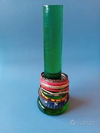 Elegante supporto vintage verticale in vetro pieno probabilmente di area muranese o empolese. Realizzato con una colonna cilindrica con una caratteristica linea rastremata: il fusto, infatti, tende a restringersi leggermente verso l'alto, passando da una base più solida a una superficie superiore di circa 3,8 cm, La una base circolare è stabile, l'oggetto è stato concepito principalmente come porta bracciali o espositore per orologi, sebbene la sua linea essenziale lo renda perfetto anche come scultura decorativa o fermacarte di pregio. Il materiale è un vetro massiccio ripieno di color verde smeraldo. Con un'altezza di 24,5 cm e una base di 9 cm, la struttura vanta una notevole solidità, confermata dal peso di 987 grammi. La lavorazione a vetro pieno permette alla luce di attraversare l'intero corpo dell'oggetto, creando riflessi profondi che esaltano la purezza della materia. Buone condizioni generali. Potrebbe avere qualche lievissima imperfezione data dal tempo, dall'uso e dalla conservazione. (I bracciali in fotografia sono esposti solo come esempio e non fanno parte della vendita.)