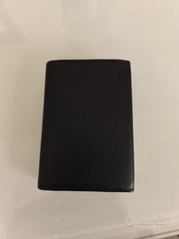 Porta carte di credito, in pelle nera , molto slim , comodo da mettere nella tasca davanti dei pantaloni.