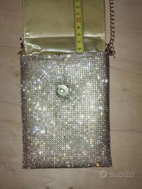 Porta cellulare a tracolla color oro con strass. Dimensioni nelle foto Condizioni nuovo senza etichetta Chiusura a bottone