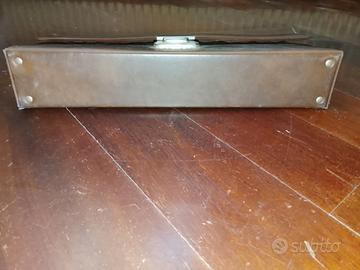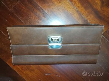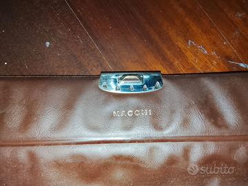 Borsa porta documenti marrone, in similpelle, marca Macchi. Scomparti in ordine alfabetico, a fisarmonica, in cartoncino. Chiusura con clip a gancetto, con altezza regolabile (la parte in metallo a forma di "u" si tira verso il basso). Qualche piccolo strappo, uno dei quali riaccomodato con lo scotch nella fisarmonica.