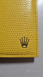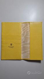 In vendita un rarissimo e iconico porta documenti originale Rolex in pelle gialla, parte integrante della collezione "Beach" introdotta nei primi anni 2000. Questo accessorio è estremamente difficile da reperire singolarmente ed è essenziale per completare il "Full Set" di un Daytona Beach Yellow 116519. Design: Interno con scomparti per card/garanzia e spazio per libretto o traduzioni. Marchi: Logo Rolex "Coroncina" e scritta "ROLEX GENEVE" impressi in oro all'interno.